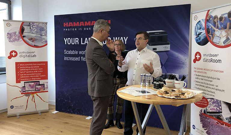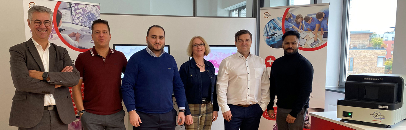 The ShowRoom in Cologne was inaugurated by two European managers of Hamamatsu, Emmanuel Pirson, Digital Pathology Business Development Manager Europe, Dr. Jay Abdin, Sales Manager EMEA, and Dr. Erk Klopp, Group Leader Business Development & Manager Digital Pathology Solutions at Hamamatsu Deutschland, along with Smart In Media partners: CEO Dr. Detlef K.-H. Finkler, Head of Marketing Corina Turner, and Product Managers for Digital Pathology Solutions Jessica Frohnhöfer and Amine Belaadel.