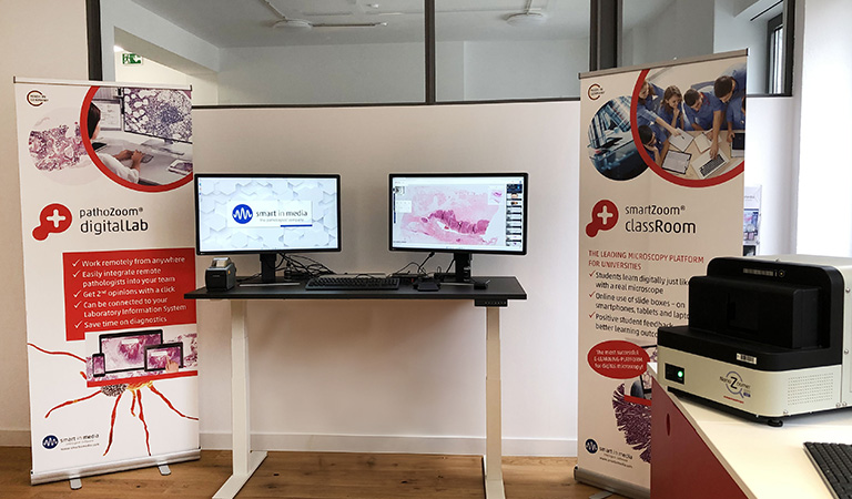 Visitors are encouraged to bring their own slides, which can be digitized using the Hamamatsu NanoZoomer S20MD Digital Slide Scanner. These digitized slides can then be imported into the cutting-edge PathoZoomⓇ Digital Lab diagnostic platform from Smart In Media. The Demo Lab offers an immersive experience, allowing visitors to conduct digital diagnostics with their specimens, including testing AI modules, achieving seamless integration into a LIS, and sharing cases live with colleagues worldwide during their visit.