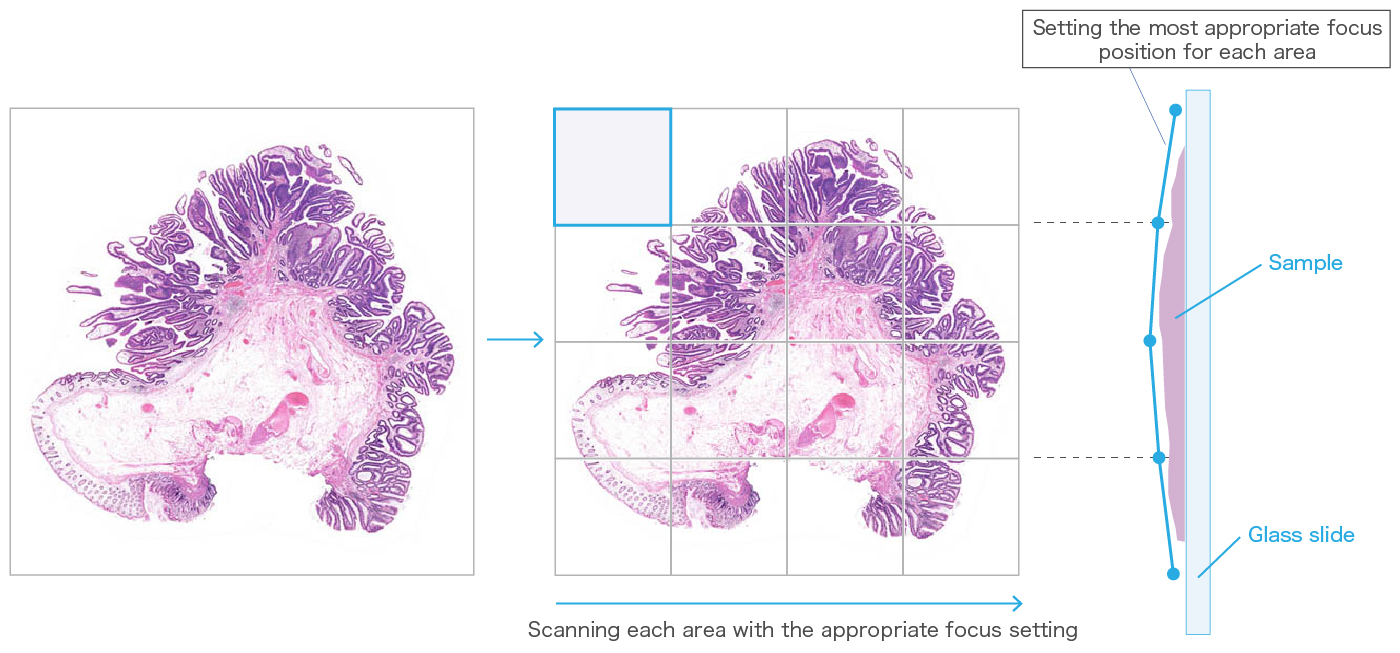 NDP.scan can adjust the focus as though it were tracing the sample surface. The NanoZoomer series uses a single focal plane for even surfaces, but if the surface of a sample is uneven, the NanoZoomer series will break the sample area up into smaller regions and assign an appropriate focal plane to each area.