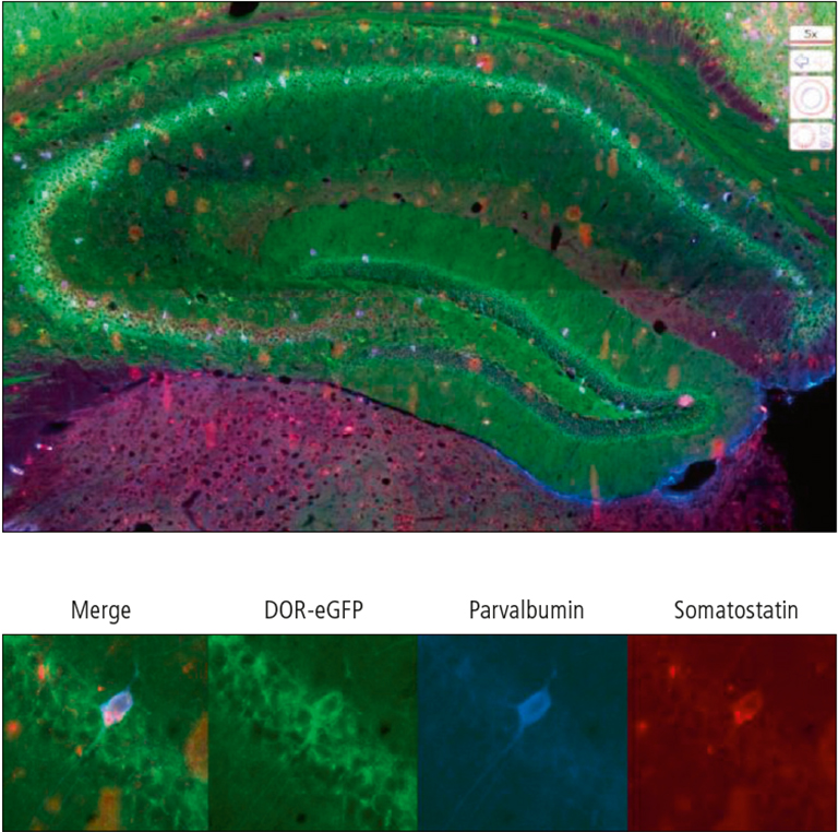 Figure 1: Identification of the neuronal subtypes expressing DOR-eGFP in the hippocampus by co-localization with specific neuronal markers. General view of the hippocampus (above) and individual neuron co-expressing DOR-eGFP, somatostatin and parvalbumin (below).the right are shown from the side.
