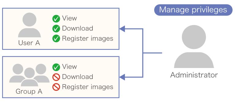 The server administrator can set and manage passwords and access permission for each user/user group.